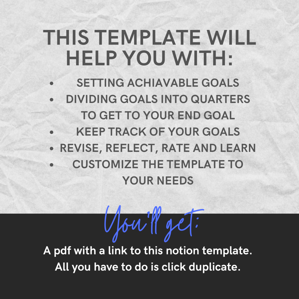 Start taking control of your time and achieving your goals with our 12 WEEK YEAR Notion template. It is a perfect tool for anyone looking to boost their productivity and get things done efficiently.