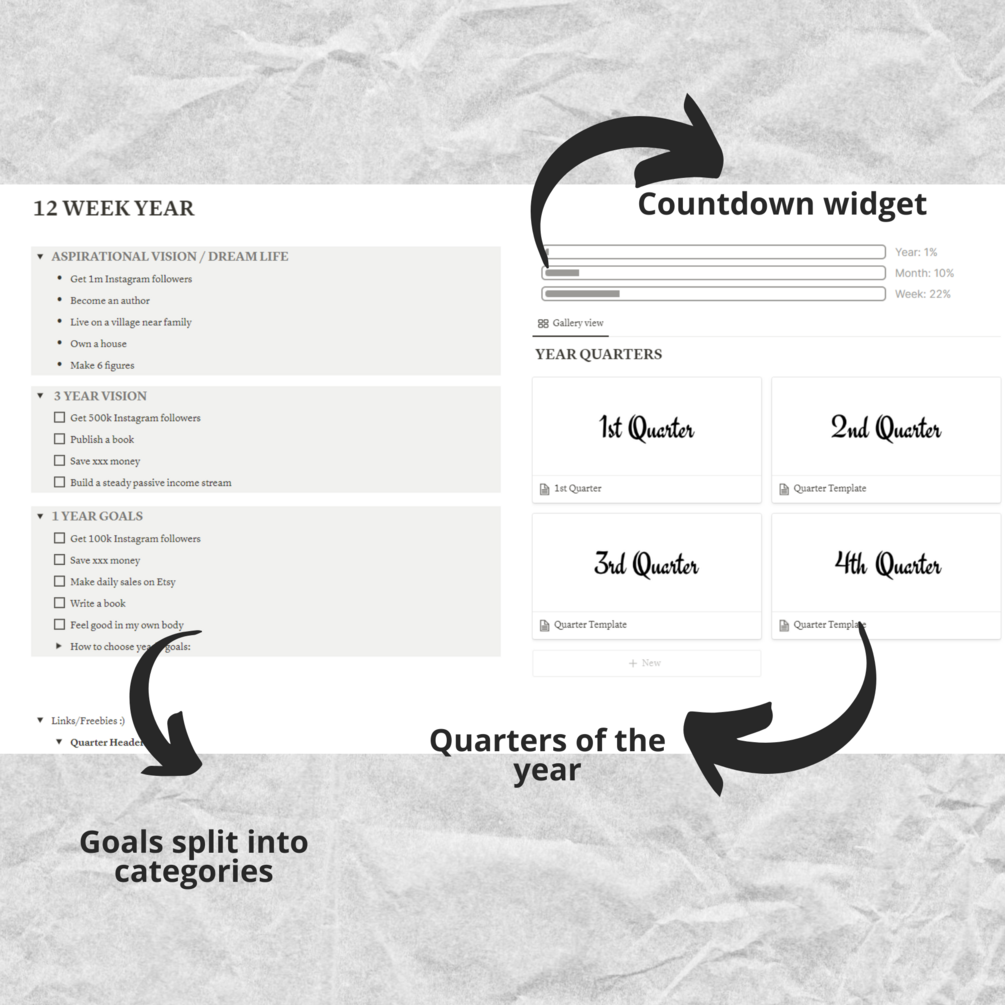 12 WEEK YEAR Notion Template 2025, goal planner, yearly project planner, digital planner, online planner, reusable planner, minimalistic