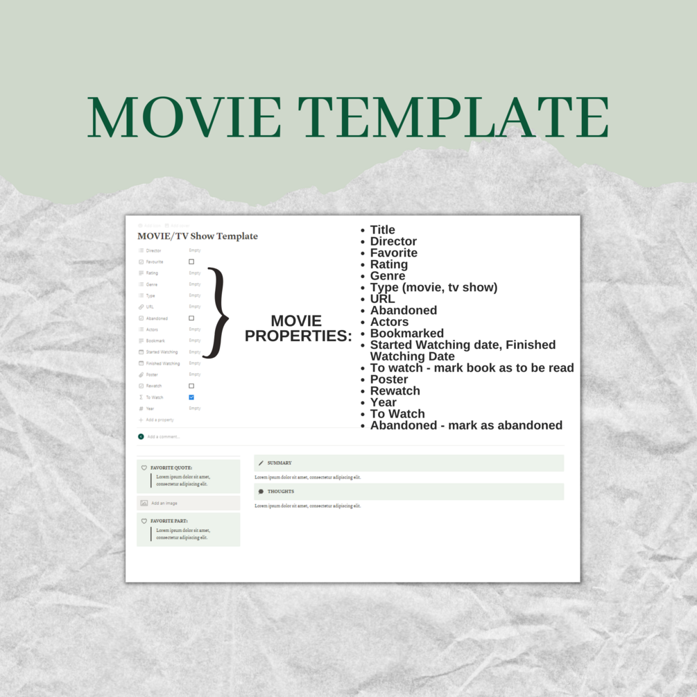 The template includes a number of helpful sections, including a watchlist section where you can add all the movies and TV shows you want to watch, a currently watching section where you can track the movies and TV shows you are currently watching, and a finished section where you can keep record of the movies and TV shows you have completed. The template also includes a movie template where you can take notes, rate the movies and TV shows, and add any other information you find relevant.